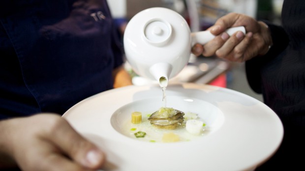 Off a busy street, a slightly hidden entrance to Tim Raue in the back courtyard through archway under the building gives the arrival a bit of exclusivity. Décor of the restaurant has a feel of a chic and spacious office. Odd pieces of china and birdcages dotted around and it is on the whole relaxed and comfortable. The six course spring menu starts with an assortment of small dishes including Japanese radishes, raw sweet prawn with a cognac reduction, marinated pork belly, all exciting and teasingly small enough to make one wanting more.
